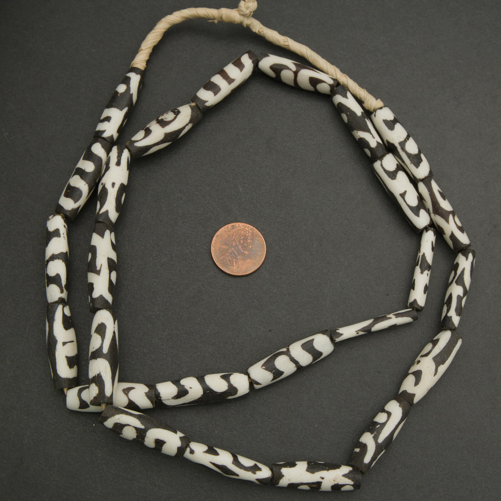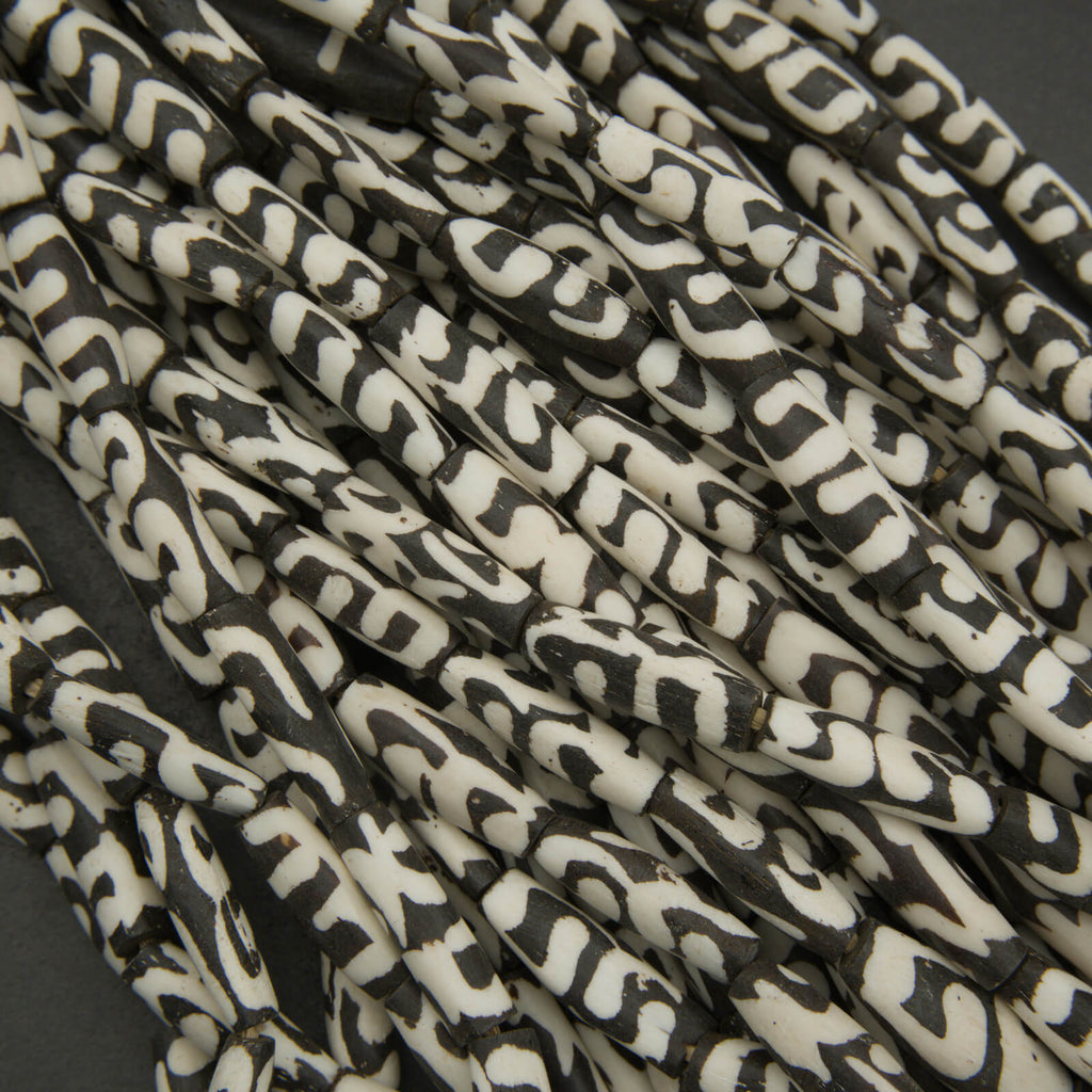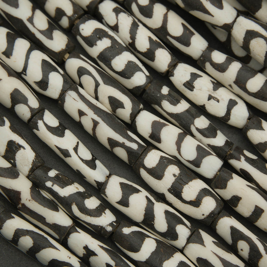 These African batik bone beads feature elongated tube shapes with bold, hand-applied patterns that create a striking, high-contrast look. Each bead is individually crafted from natural bone and finished using a traditional wax-resist dyeing technique, resulting in slight variations that add to their character and authenticity.
