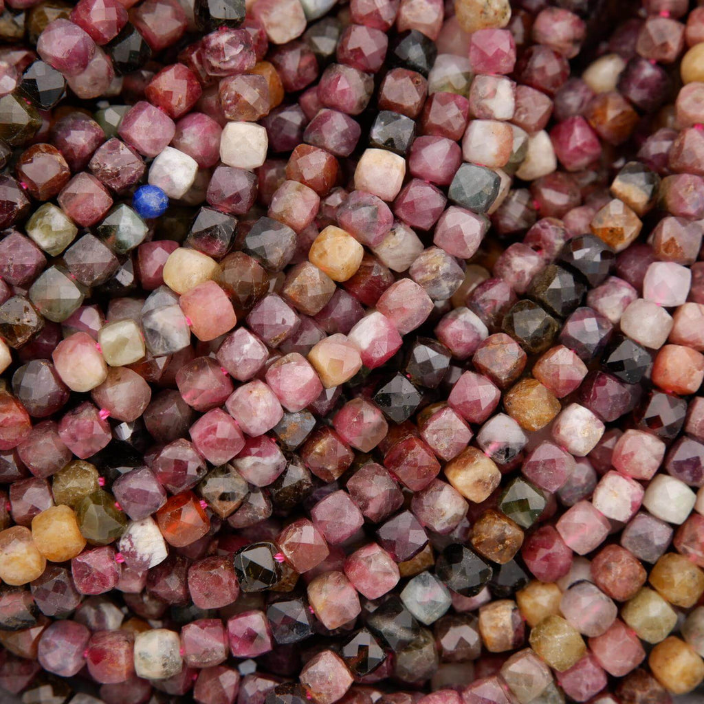 These stunning faceted cube beads feature natural watermelon tourmaline in an earthy, rosy color mix ranging from soft blush pinks and berry reds to mossy greens, smoky neutrals, and occasional icy whites and teals. Each bead with subtle facets that add a gentle sparkle while maintaining a raw, organic charm.