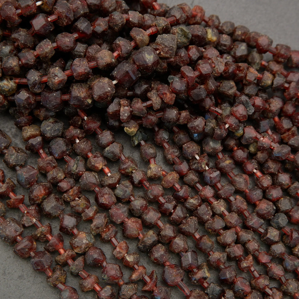 These natural rough garnet beads display deep wine-red to earthy burgundy tones with raw crystalline faces that give each bead a rugged, organic character. Garnet is a group of silicate minerals that commonly forms dodecahedral crystals in metamorphic rocks, often showing iron-rich compositions that produce its signature dark red color. Metaphysically, garnet is often associated with vitality, grounding energy, and the spark of motivation and passion.